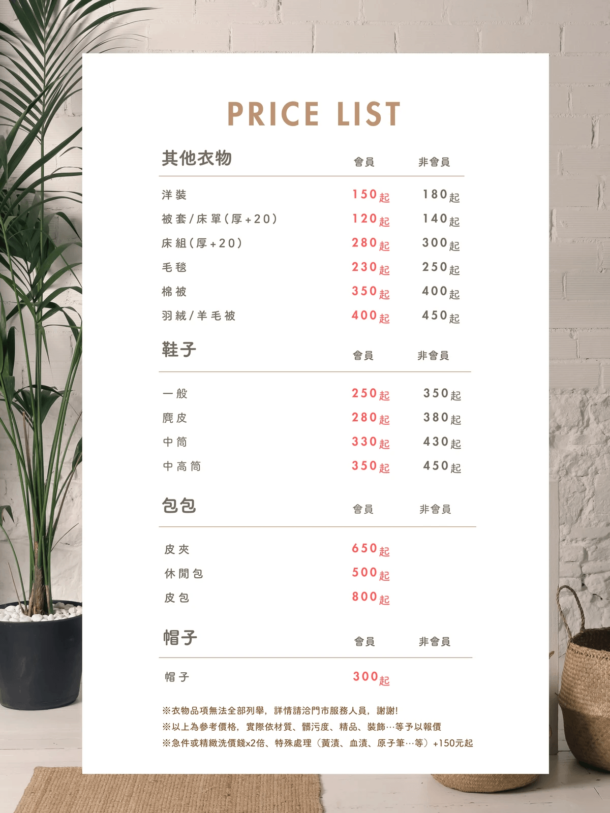 洗包包/洗帽價目表